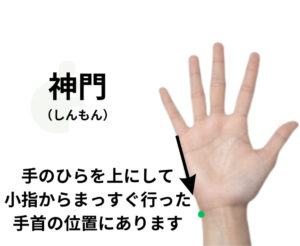 手首のシワ上で、骨と腱の間のくぼみが目印です。